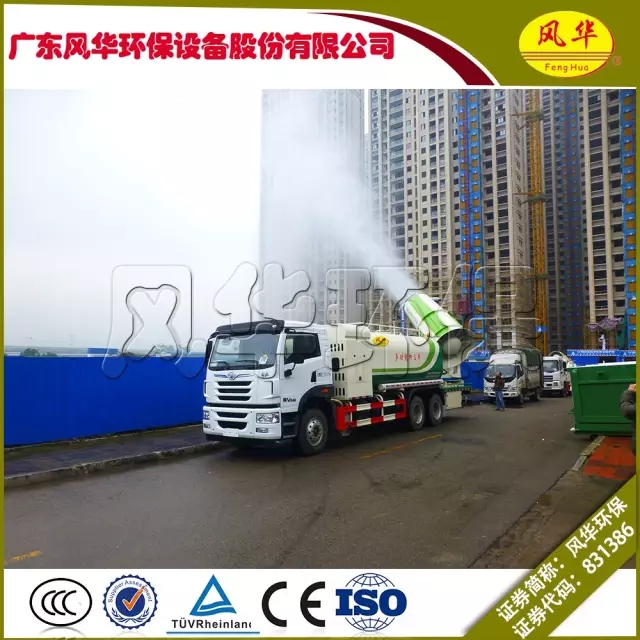 高強霧炮抑塵車的工作效率約為普通灑水車的十幾倍,相比普通灑水車噴出的水流,水霧顆粒極為細小,達到了微米級,其吸附力也增加了3倍,耗水量卻降低了70%,遭遇霧霾天氣、空氣質量PM2.5嚴重超標時,可有效進行液霧降塵、分解淡化空氣中的顆粒濃度、將飄浮在空氣中的污染顆粒物、塵埃等迅速逼降地面,達到清潔凈化空氣和防暑降溫的效果。