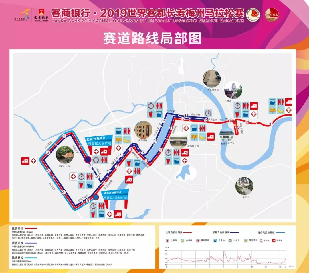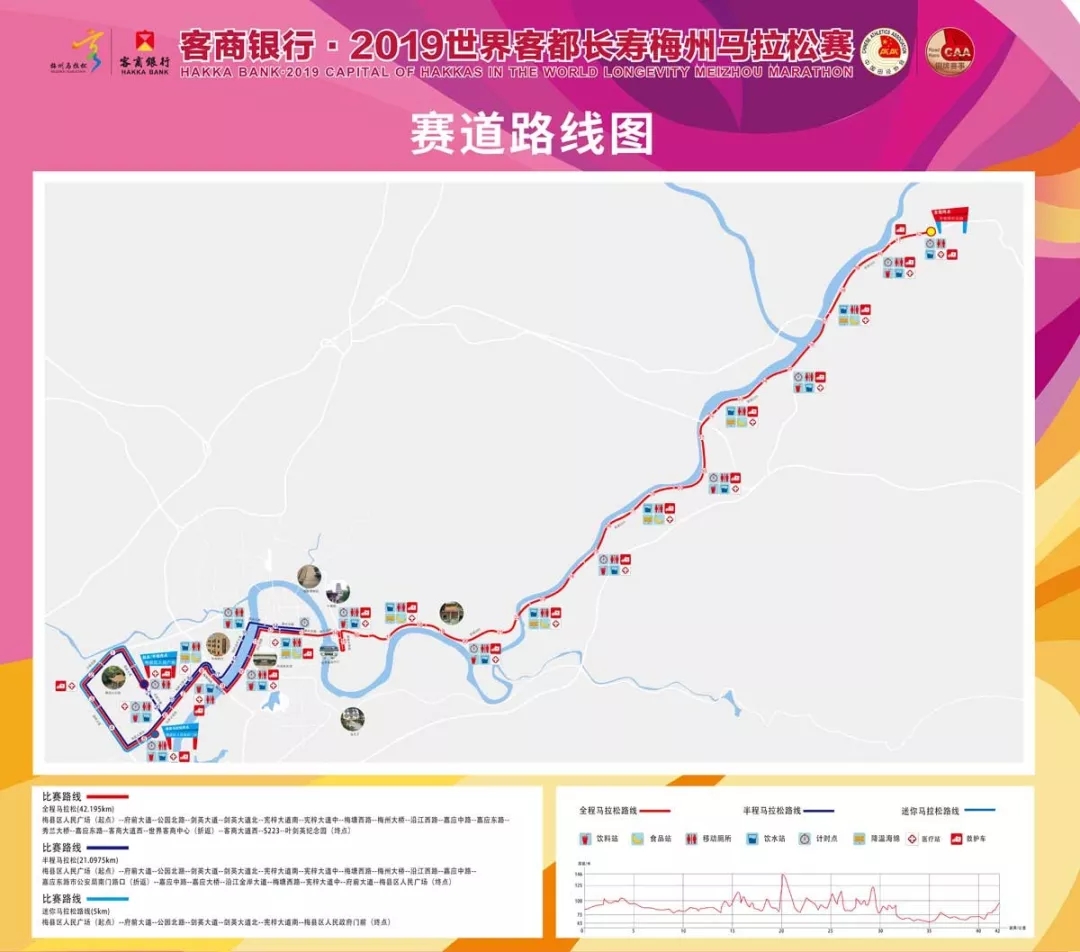 今年梅馬沿用去年經典路線,起點為梅縣區人民廣場,選手將沿梅江兩岸奔跑,途經劍英體育館、世界客商中心、國際慢城雁洋鎮等梅州地標建筑,盡覽世界客都風情。全程馬拉松終點設在葉劍英紀念園,半程馬拉松終點設在梅縣區人民廣場,迷你馬拉松終點設在梅縣區人民政府門前。